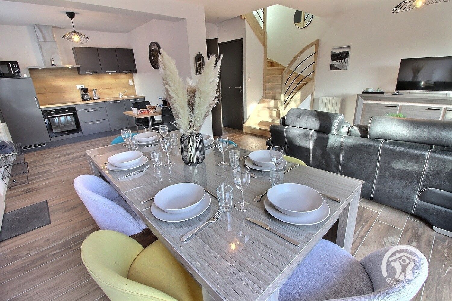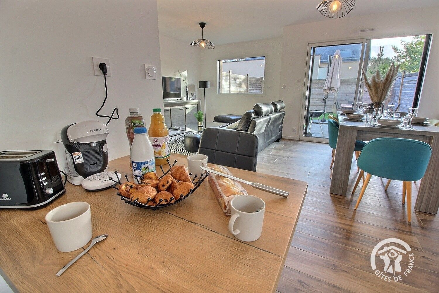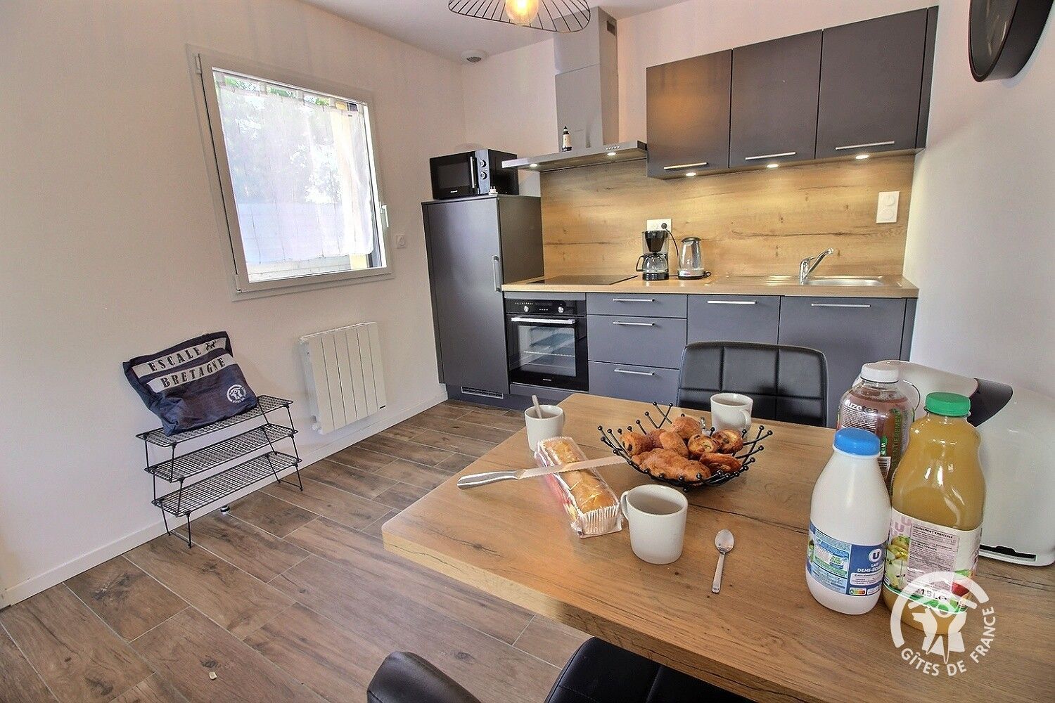 - Une cuisine équipée ouverte avec notamment : bouilloire électrique, four, four à micro-ondes, grille-pain, lave-vaisselle, plaques de cuisson
