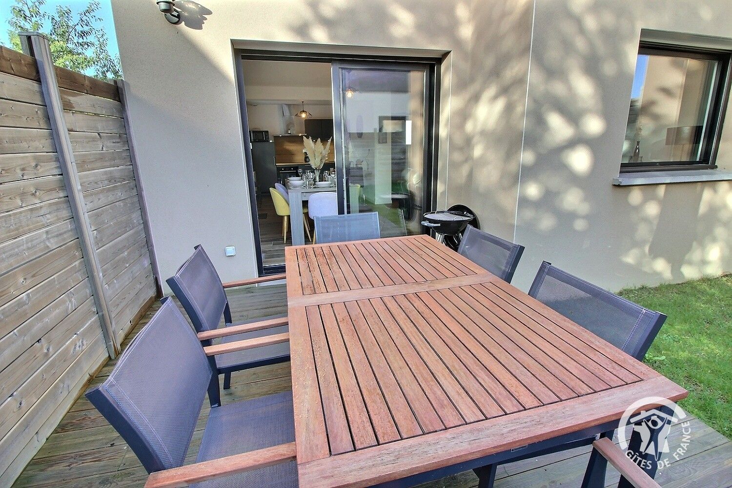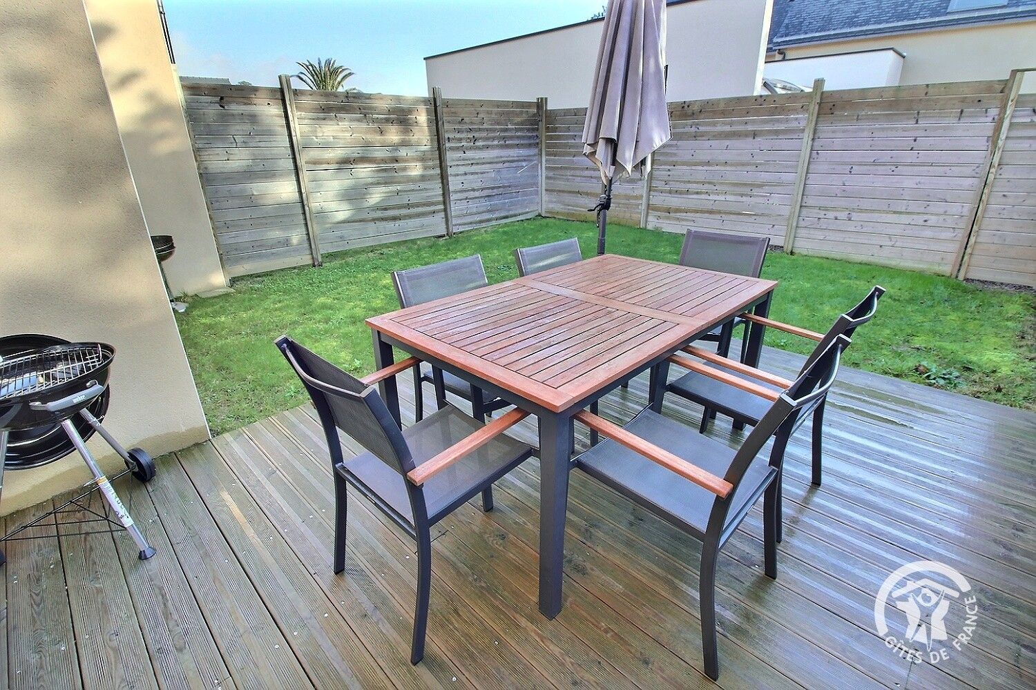 - Terrasse en bois exposition sud de 12 m² avec salon de jardin complet pour 6 personnes, deux transats et un parasol