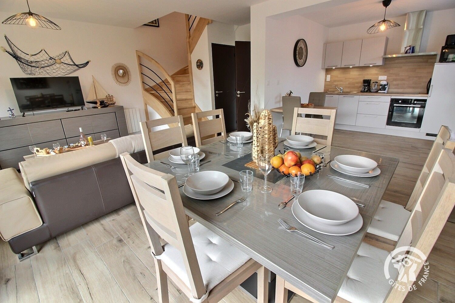 - Une cuisine équipée ouverte avec notamment : bouilloire électrique, four, four à micro-ondes, grille-pain, lave-vaisselle, plaques de cuisson